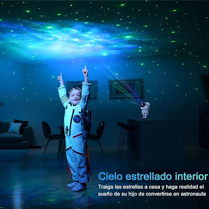 Un proyector con forma de astronauta funciona proyectando imágenes o luces en el techo o las paredes. Generalmente, tiene una lámpara LED incorporada que emite luz en formas específicas, como estrellas, planetas, o galaxias. Algunos modelos permiten cambiar las imágenes proyectadas o ajustar la intensidad de la luz. Dependiendo del modelo, también puede conectarse a un teléfono móvil o una fuente externa para proyectar contenido multimedia.